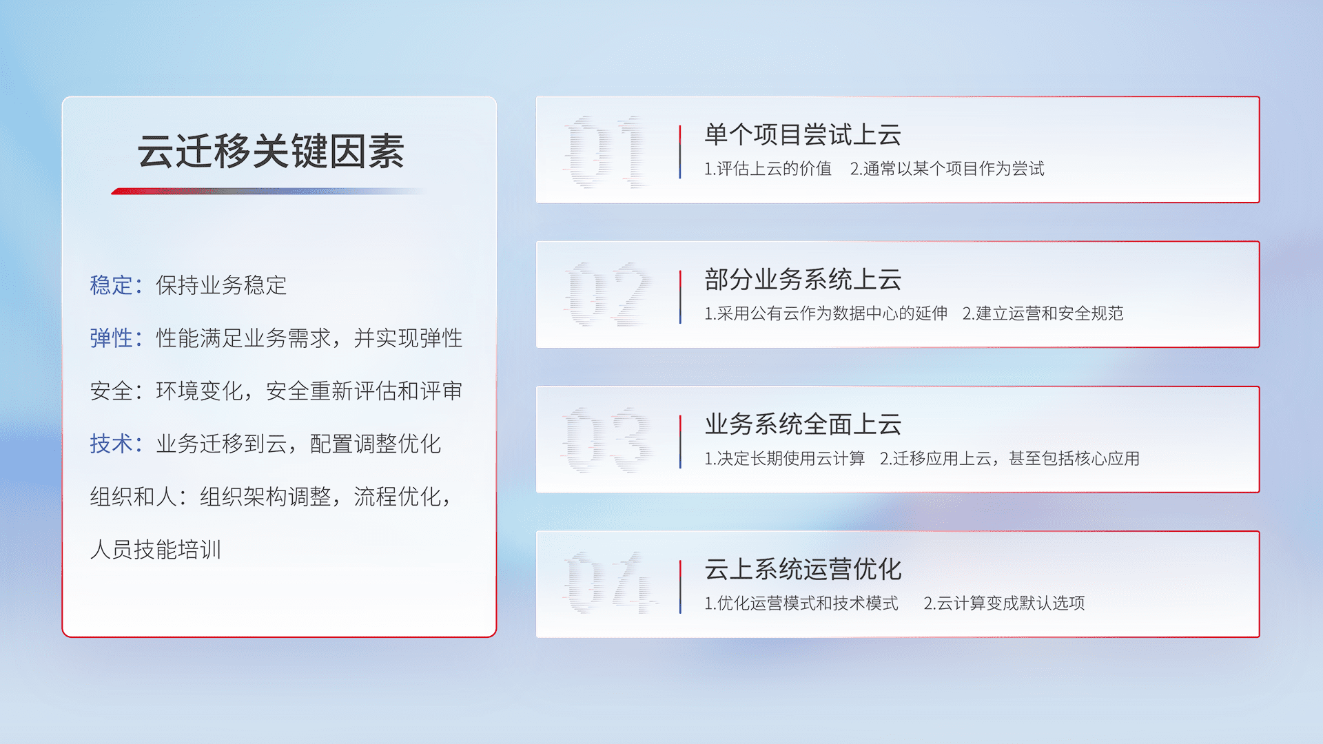 结合实际业务,,,从规划设计、、、云平台选型、、云原生改造、、数据迁移、、集成交付,,,,迁移全过程为客户识别最佳上云路径,,,,做好风险识别管理,,,,设计网络架构、、、、身份权限、、安全审计合规、、、、操作审计、、日志审计、、、监控告警策略、、、多站点容灾设计等,,,对云上基础设施进行整体规划,,提升IT治理水平,,,以满足弹性、、、、高可用、、高性能的需求。。。