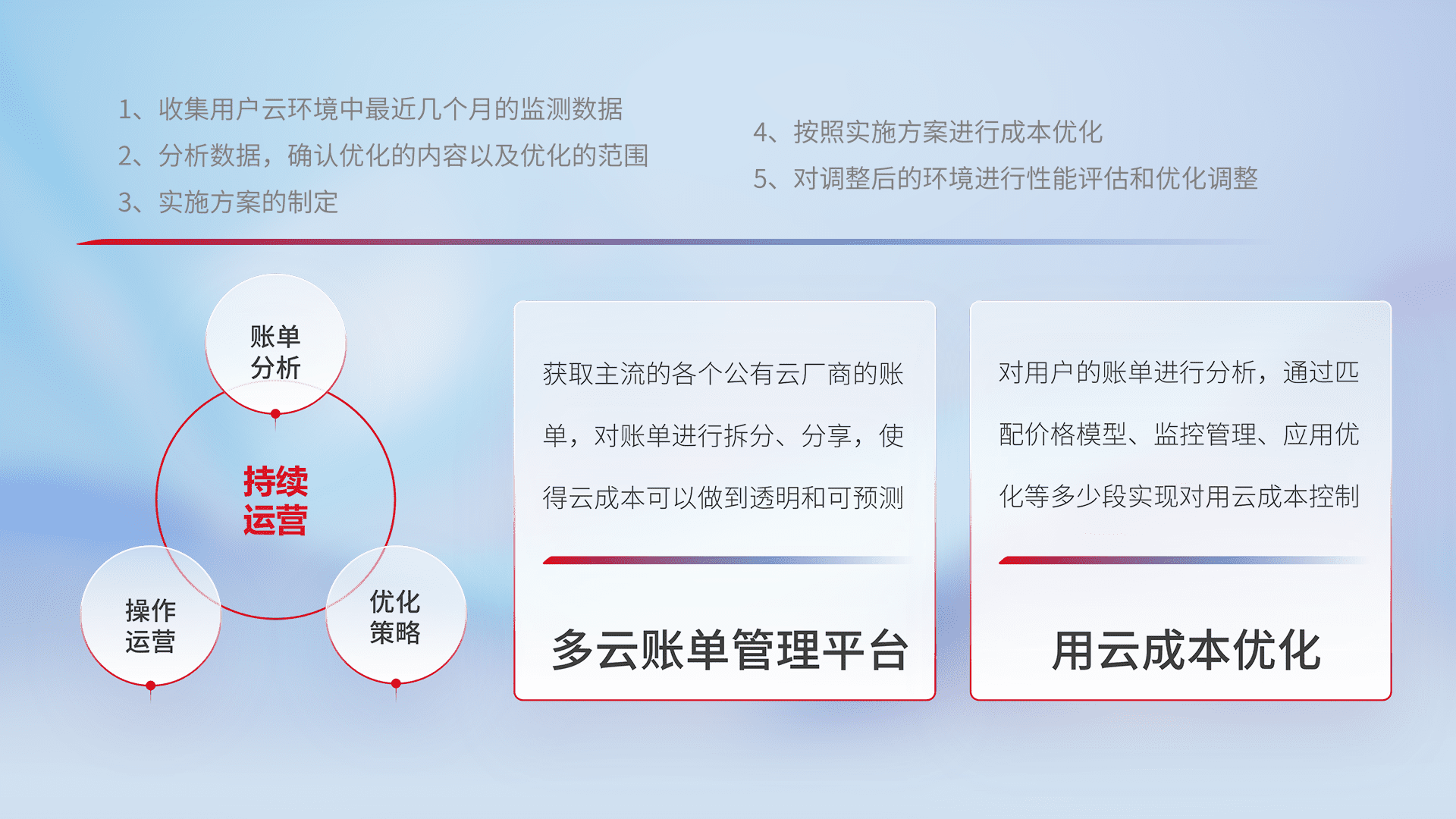 通过多云纳管,,,以统一的资源数据模型把客户的云资源进行抽象和封装,,,进而实现对多云资源的统一操作,,,,保障云资源管理的可靠性、、、稳定性与可用性。。量身定制化运维内容,,配置、、、、开发运维、、、、补丁管理、、、、备份、、、监控、、、、认证和访问管理、、审计和日常巡检等,,,保障在用云过程中的可靠度,,稳定度以及高可用率。。